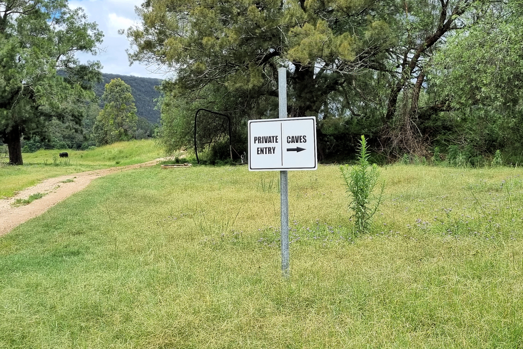 Located on private property, access is via a dirt track just off Welshs Road. Although the property is privately owned, you are allowed access to the cave, but be respectful and remember no camping is allowed here. On our visit, a creek crossing just off the road, had been washed out. This meant we couldn’t drive all the way in, but it was only a short flat walk in. A sign at an intersection points in the direction to go.