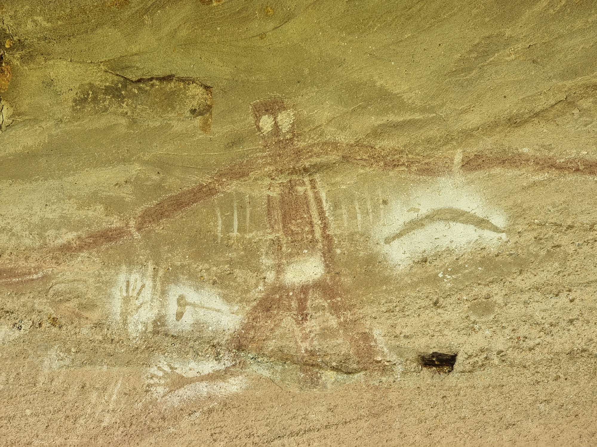 The painting depicts Baiame with arms outstretched looking over the river valley. Also visible are hand and arm stencils, representing the people who cared for and maintained the cave. There are also axe and boomerang stencil around the main figure.