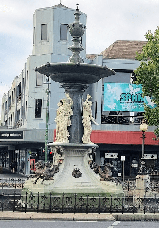 Located at Charing Cross, it’s the city’s grandest civic fountain, built with marble and bronze. The fountain is located in Bendigo’s Charing Cross area at the intersection of View Street and Pall Mall. Charing Cross stands at the centre of the city and is one of Bendigo’s busiest and most prominent intersections. The fountain stands opposite the main entrance of Rosalind Park and the Bendigo Sign.
