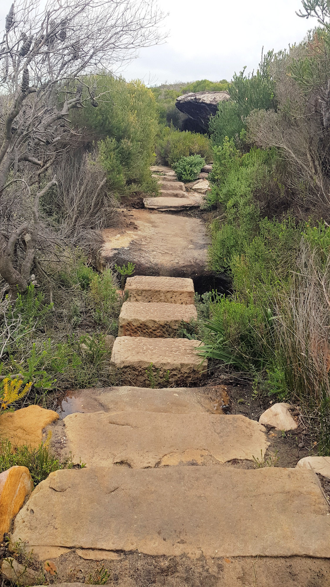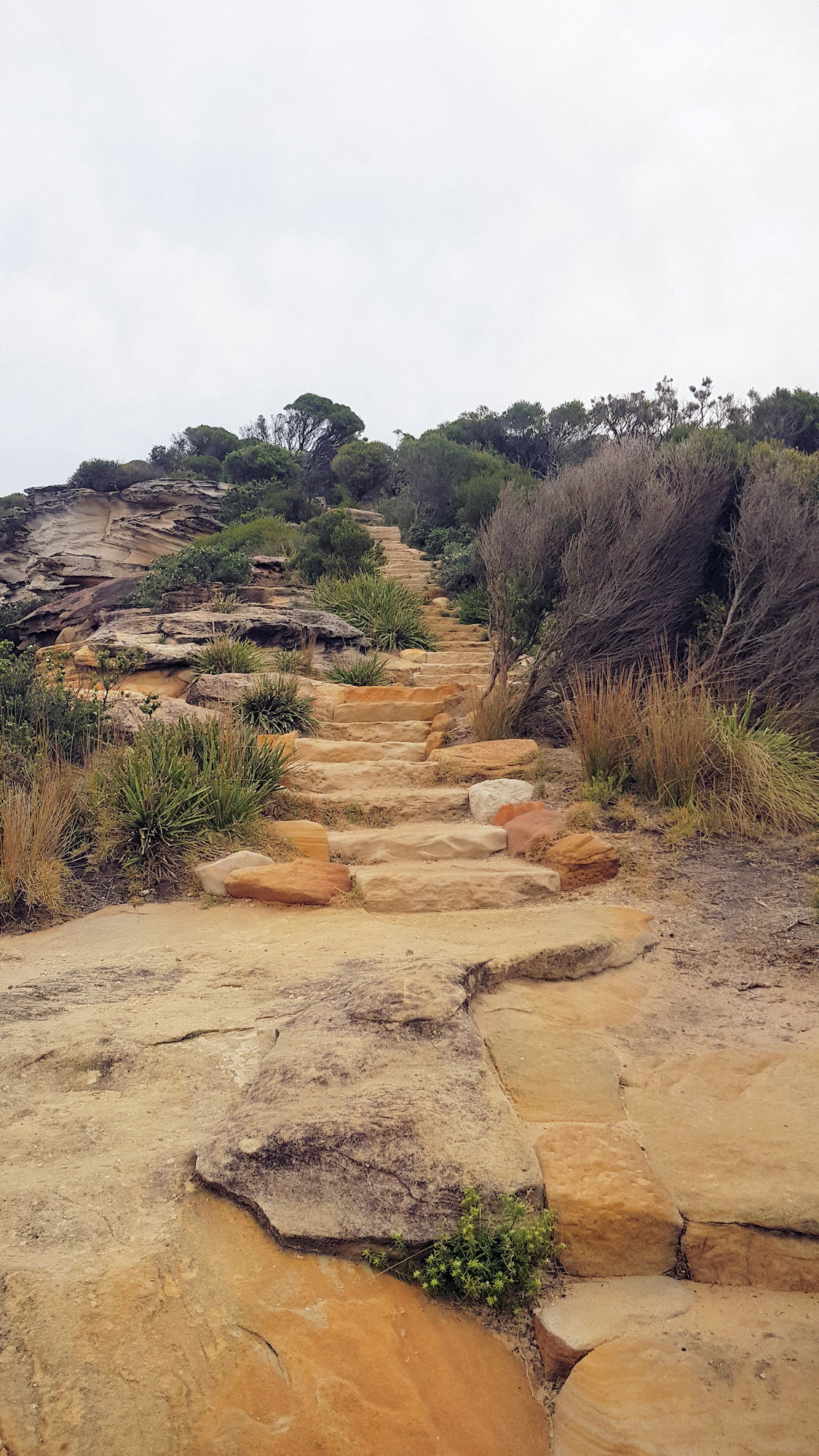 From the carpark, follow the coast track through coastal scrub and amazing ocean views. The 45 minute walk is generally flat, but there are several section with steep steps to climb. When we walked, the track was in excellent condition, with much of it on formed board walk. Steps are made of sandstone, carved into the slopes, while some areas travel over bare rocks. Where no track is obvious, like over rocks, it is well sign posted, making it easy to follow.