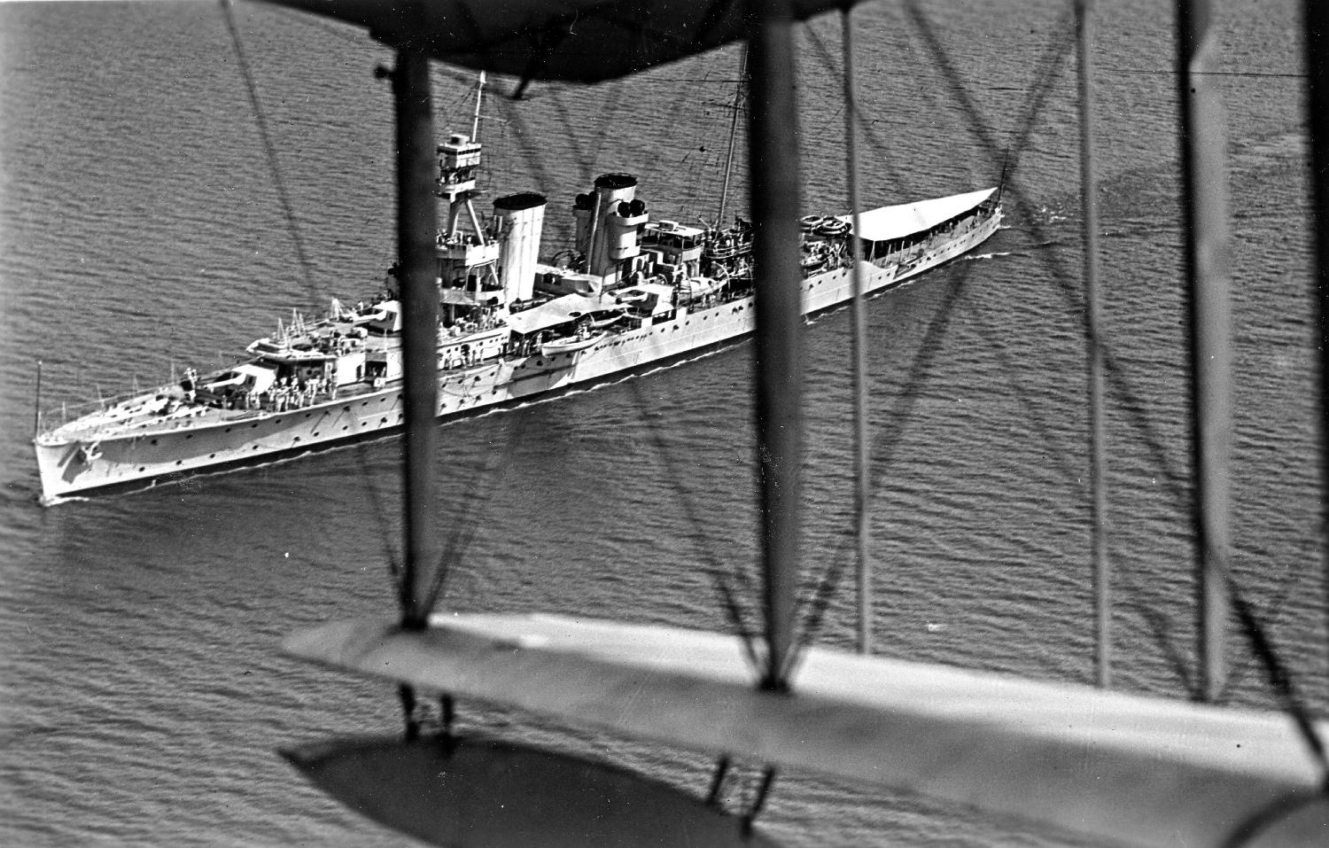 HMS Frobisher a Hawkins-class heavy cruiser (along with her sisters HMS Hawkins (the name ship), HMS Raleigh, HMS Effingham, and HMS Cavendish (later renamed Vindictive)) of the British Royal Navy. was commissioned on 20 September 1924 and initially served as flagship of the 1st Cruiser Squadron in the Mediterranean Fleet. During the late 1920s, she operated between the Mediterranean and Atlantic fleets, briefly serving on the China Station and participating in various fleet exercises. Her early service included experimental work with aircraft equipment, having a prototype catapult fitted in 1927-1928.