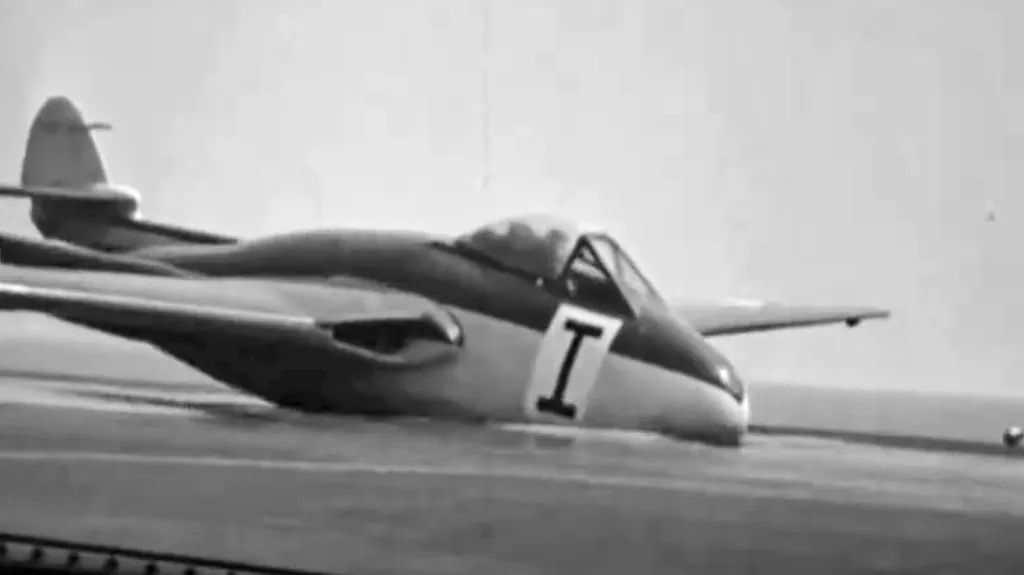 Despite the success of this trial, there were still many misgivings about the suitability of operating jet aircraft routinely from carriers, particularly concerning landing speed and operational range. As a possible solution an experimental flexible “rubber” deck was proposed, whereby jets would not require undercarriage. A reinforced fuselage and the removal of undercarriage allowed the aircraft to belly land on a rubber deck. This would extend range by allowing more fuel to be carried.