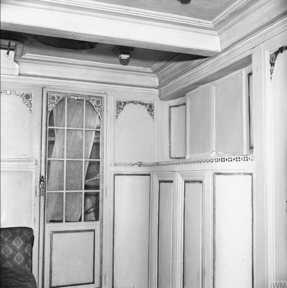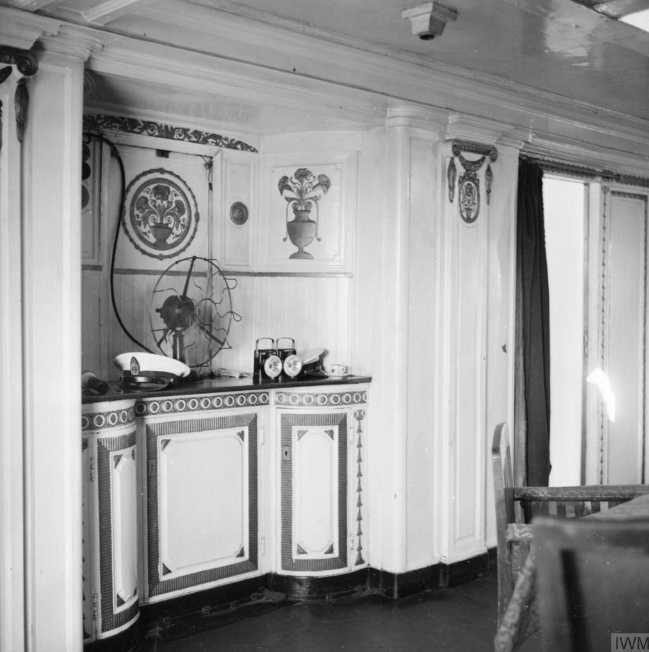 Centre of forward wall of Admiral’s cabinAdmiral’s writing room – starboard side, forward of day cabin, forward wallAdmiral’s day cabin – rear and starboard wallsAdmiral’s day cabin – forward and starboard walls