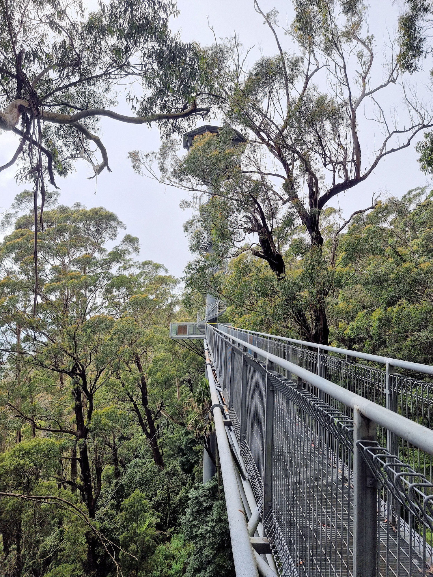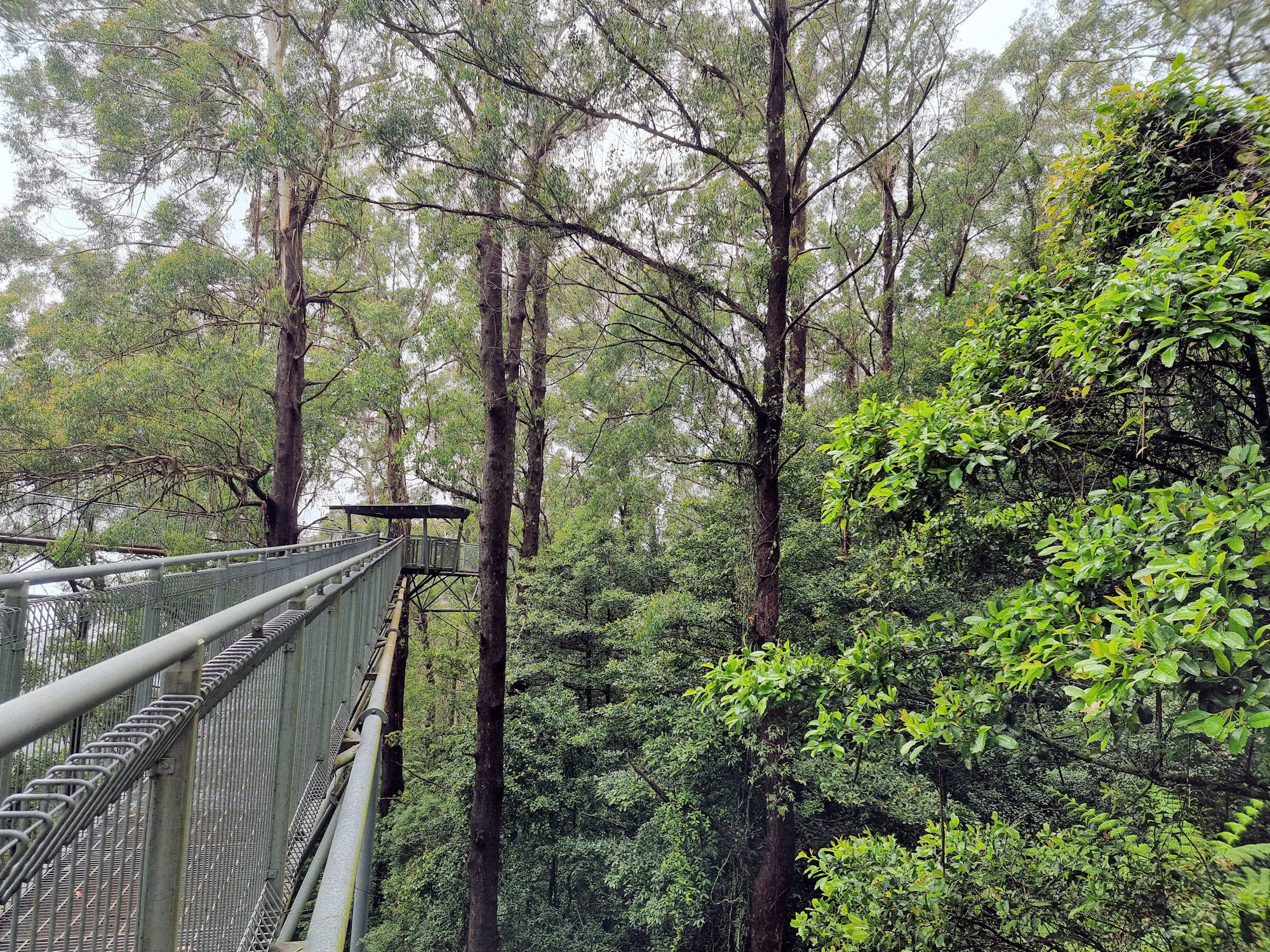 The 500m walkway is constructed of sturdy steel, making you feel safe when you are on it. Walking along, you look down to the forest floor 20 to 30m below. Surrounded by trees, you really are a part of the forest canopy. At two points, 25m cantilever bridges extend out from the main walkway. These bounce slightly as you walk on them, but they are very safe and anchored by large steel cables. Walking to the end of the bridges takes you over the escarpment for amazing views.
