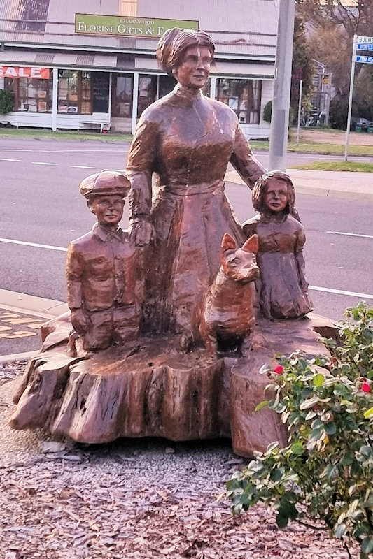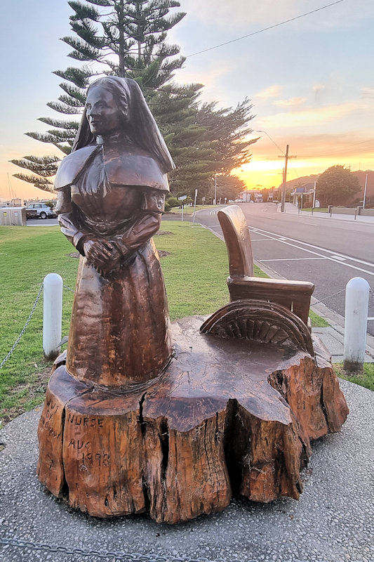 The sculptures represent a World War One soldier, a wounded soldier with a donkey, a World War One nurse, Simpson helping two wounded soldiers and a family waiting for their father. The sixth, represents a sea captain, commemorating the loss of ships and lives at Lakes Entrance.